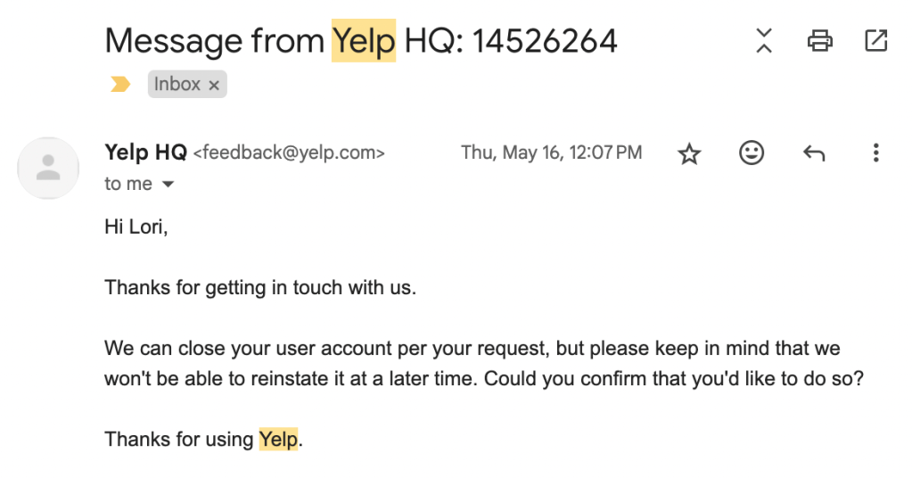 Which, lo and behold, was not an immediate process. It took a week of some back and forth before they actually removed my account and all its data.