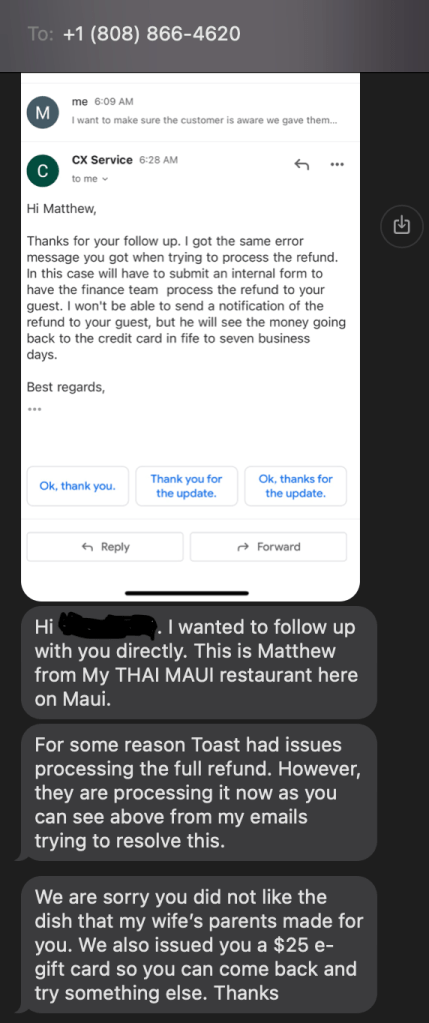 … which appeared to have good intentions, but imagine my surprise to be contacted on my personal cell by Matthew, a stranger, while I’m on vacation, continuing to guilt-trip me into feeling bad about disliking his “wife’s parents cooking.” I never asked for a refund, of course I am grateful for it, but I truly believe the most appropriate response would’ve been to just acknowledge the review and move on. There was no way I would ever disrupt my peace and enter that place again, even with a $25 credit just enough for 1 bowl of soup.